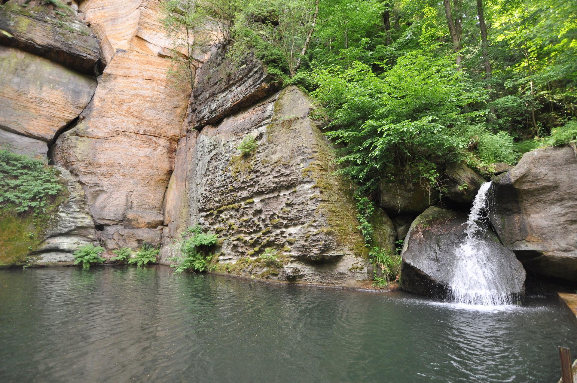 Praktické info: Úsek mezi Klopotským vodopádem a Reinhardtsdorf-Schöna je současně značen i jako úsek tzv. Lesní stezky Forststeig (žlutý pruh).